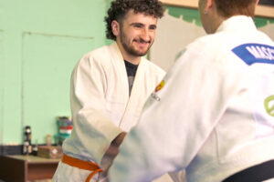 Elías, judoca, chico trans de La Blanca, Entre Ríos, juega con el cinturón de su traje, lo ata y lo desata, como si en ese nudo se abrieran y cerraran todos los escollos y los abrazos que implican insistir en su camino.