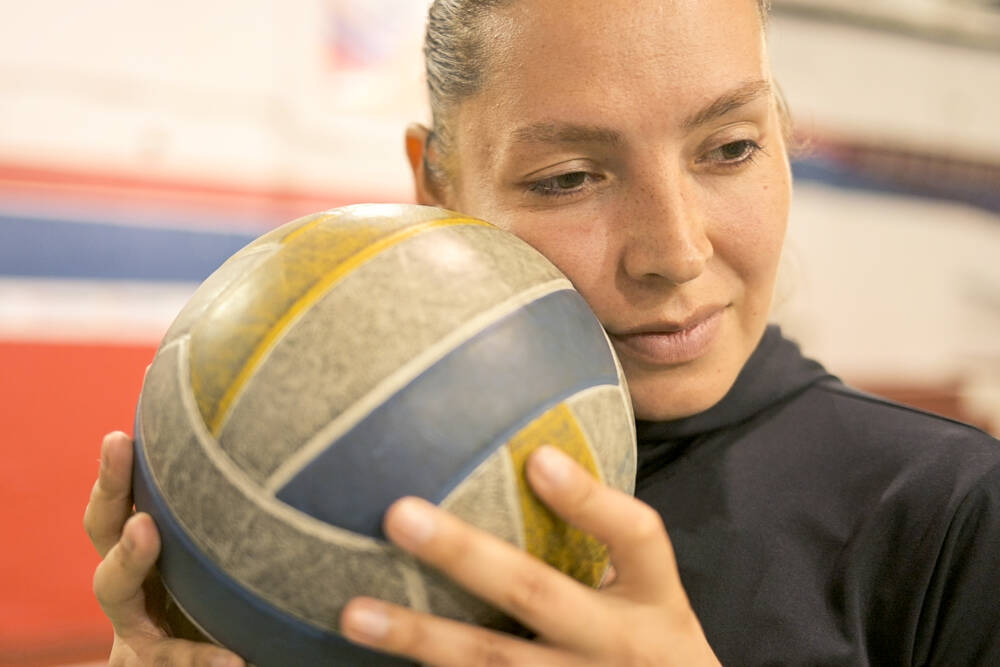Algo similar sucede con Romina, voleibolista, mujer trans salteña. La pelota de vóley va contra su mejilla. La imagen parece una foto de familia: cachete con cachete con lo más cercano.